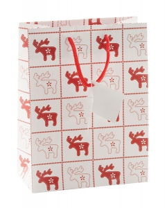 Papírová dárková taška s matným laminem ve vánočním designu a s dárkovou visačkou.